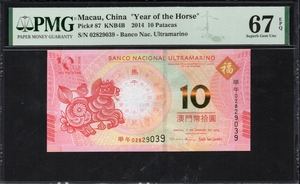 The 10 Patacas banknote from Macau, commemorating the 'Year of the Horse,' features vibrant and rich artistic details. This currency not only serves as a medium of exchange but also reflects the cultural significance and aesthetic values of the region. The note incorporates safety features such as holograms and watermarking, ensuring its authenticity. The front showcases a stylized depiction of a horse, symbolizing strength and nobility, accompanied by intricate patterns and hues of red and gold that enhance its visual appeal.